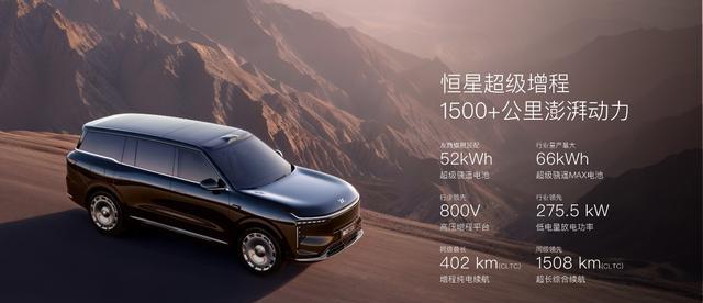 动力系统上,智己LS9搭载1.5T增程器与电动机组成的“恒星超级增程”混动系统。其中1.5T发动机最大功率114kW,系统综合最大功率390kW,零百加速时间为4.9秒。52 Ultra版配备52kW·h磷酸铁锂电池,CLTC纯电续航320km;66 Ultra版配备宁德时代66kW·h超级骁遥MAX三元锂电池,CLTC纯电续航402km,综合续航里程分别为1454km和1508km。车辆采用800V架构,支持快速充电,10%-80%充电时间分别为19分钟和16.5分钟。