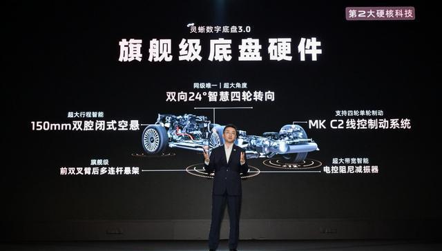 作为品牌的旗舰车型,它还搭载了智己品牌知名的灵蜥数字底盘3.0,配备双向24度智慧四轮转向系统,可实现4.95米转弯半径;并全系标配150mm行程双腔闭式空气悬架与智能电控阻尼调节系统。