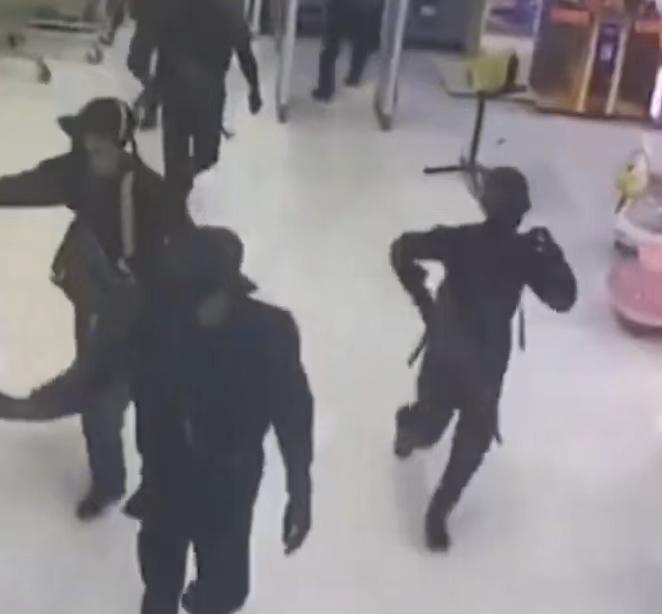 嫌犯分乘两辆皮卡车抵达商场,其中部分人留守车内,另一部分人持械闯入商场,制服保安后直奔金店实施抢劫。