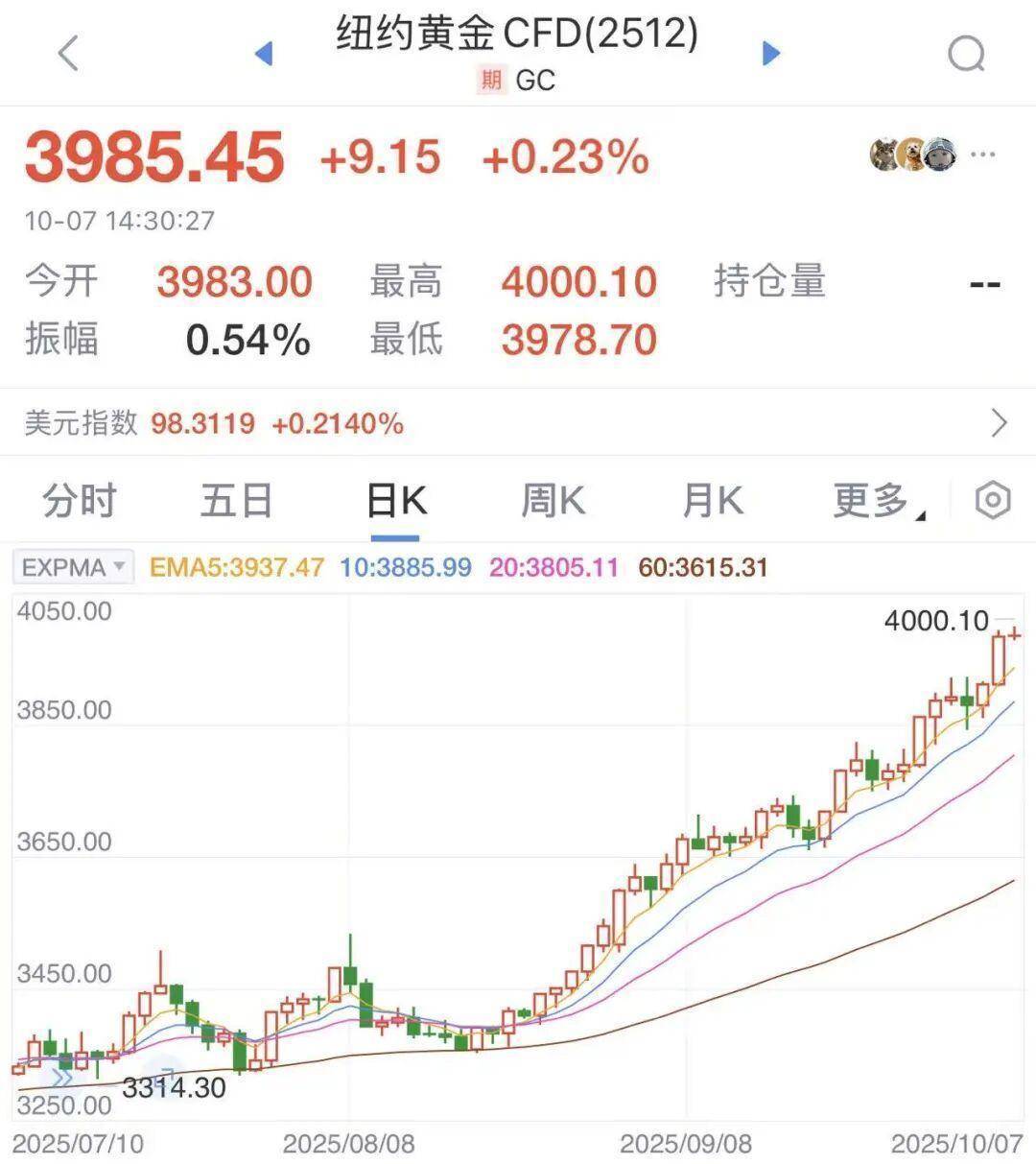 今年以来,黄金价格暴涨,截至发稿,纽约黄金期货报3985.45美元/盎司,盘中一度突破4000美元/盎司,年内涨幅已达50%。