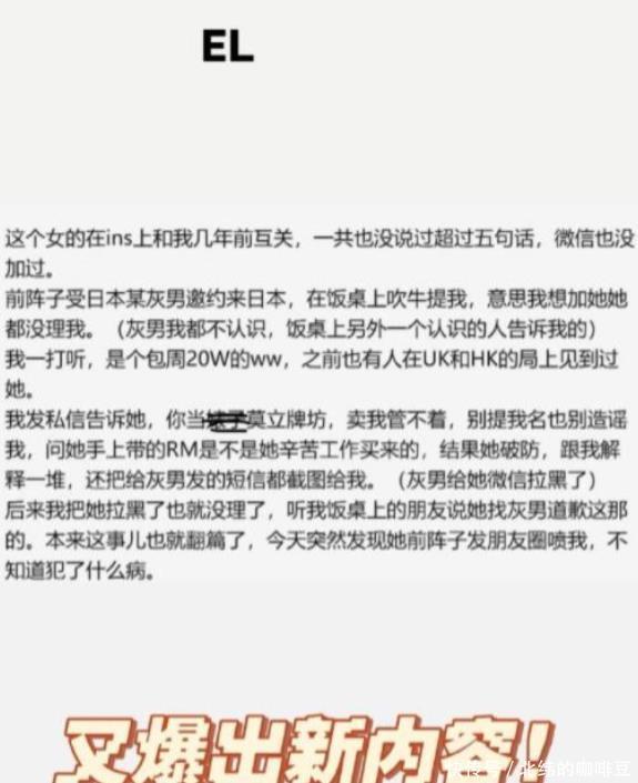 才发现EL原来就是一个20w一周的外围女。 而王思聪在知道了这件事之后就直接私信EL告诉她不要造谣。 甚至还问EL手上的RM是否是自己挣的。