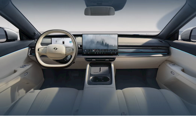 内饰提供星际曜黑、暖山玉白以及流光金橙三种内饰可选,整体布局基本延续了eπ007 的风格,标配10.25英寸仪表盘、15.6英寸中控屏,高通骁龙SA8295P车规级芯片,还支持540度全景影像哨兵模式。