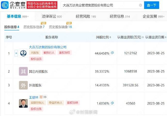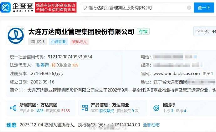 企查查信息显示,大连万达商业管理集团股份有限公司成立于2002年9月,法定代表人为张春远,注册资本约271.6亿元,经营范围包含建设工程设计、商业综合体管理服务、非居住房地产租赁等,由大连万达集团股份有限公司、王健林等共同持股,王健林为该公司实际控制人。值得注意的是,该公司现存多条被执行人、股权冻结信息。