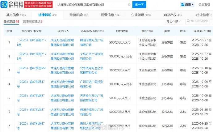 天眼查APP显示,截至目前,大连万达商管涉及股权冻结风险信息56条,被执行人高风险信息4条,历史被执行人信息38条。