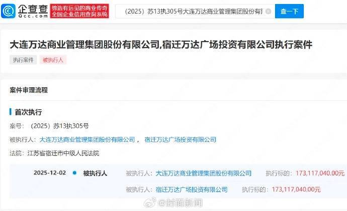 据封面新闻,企查查APP显示,近日,大连万达商业管理集团股份有限公司、宿迁万达广场投资有限公司新增一则被执行人信息,执行标的1.7亿余元,执行法院为江苏省宿迁市中级人民法院。